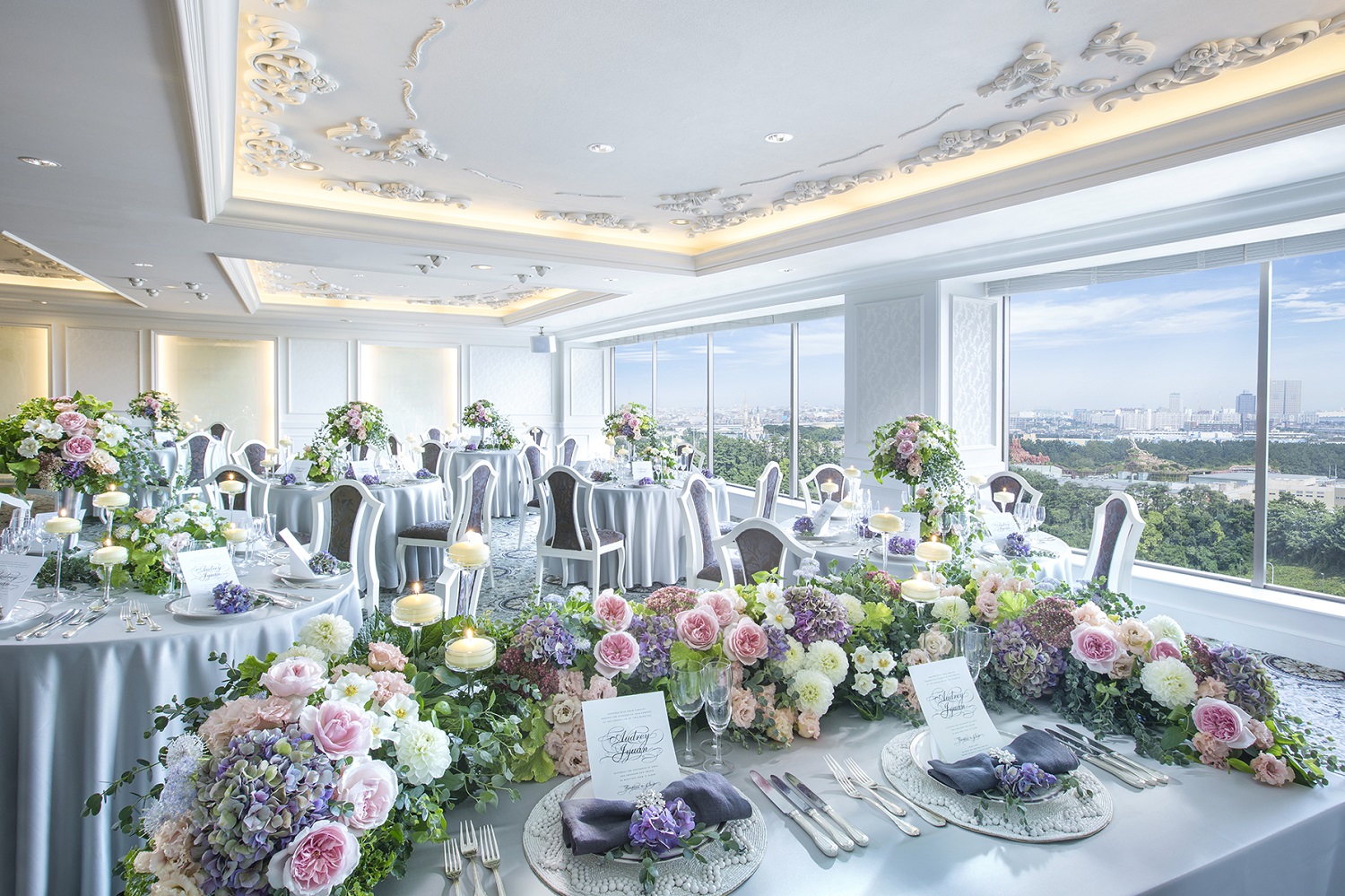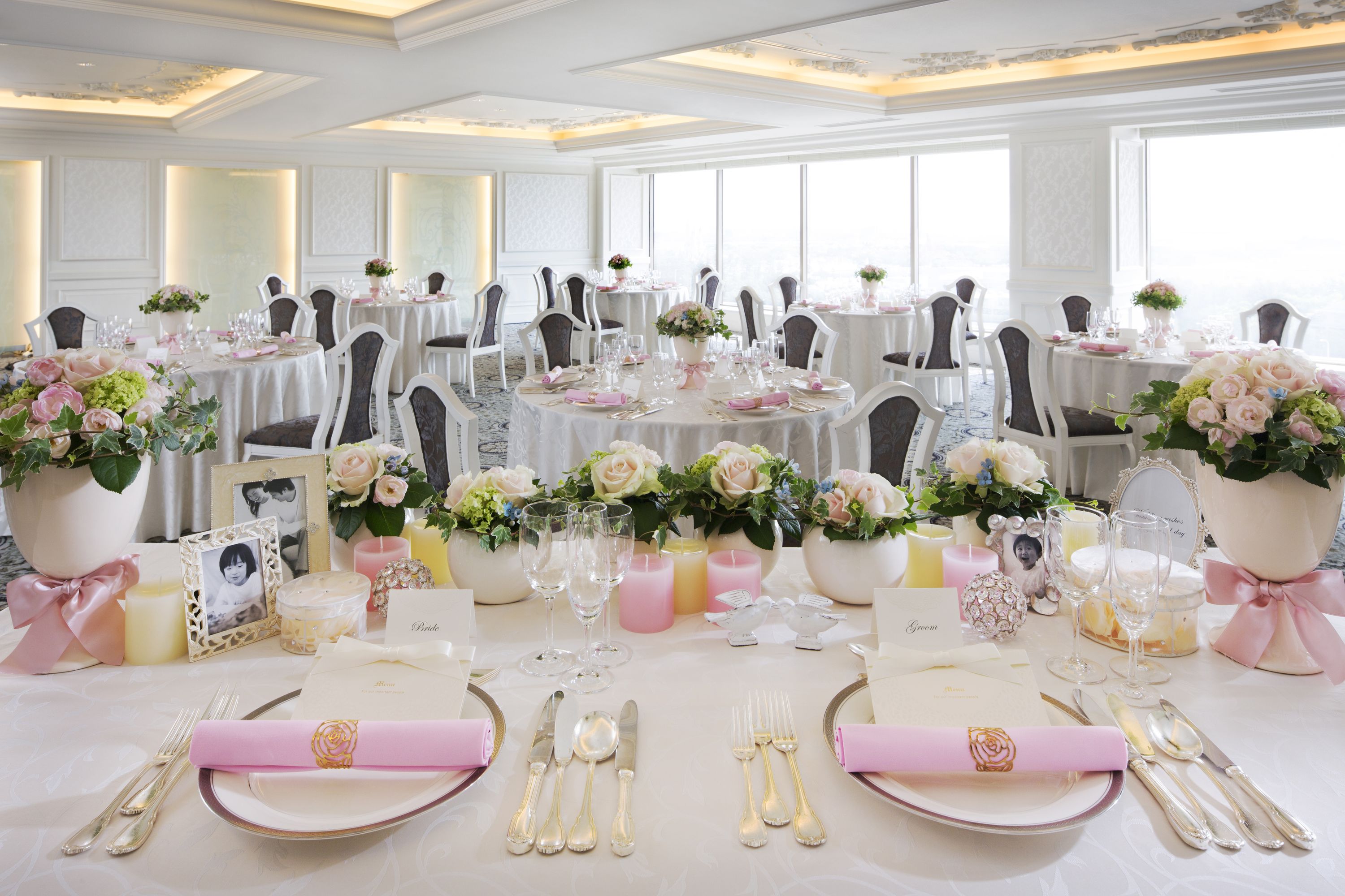 ドレスやテーブルのカラーコーディネートと一緒に、お部屋全体を、照明でカラーコーディネートしてみませんか?各場面で色を変え、お好きなイメージで会場の雰囲気を変えてみるのもいかがでしょう?